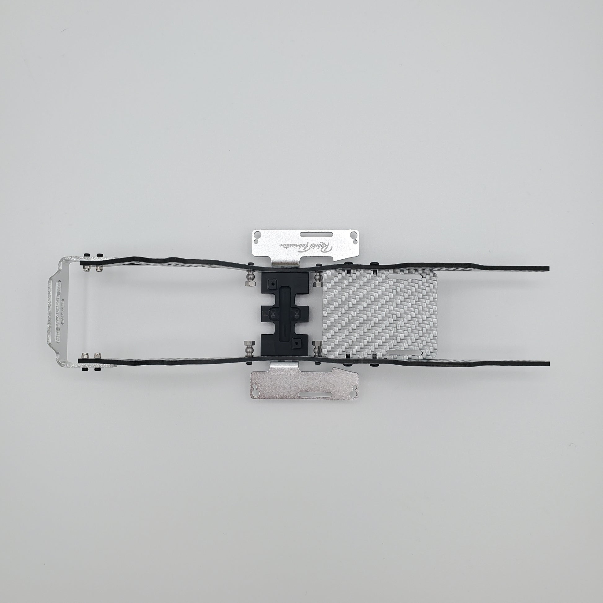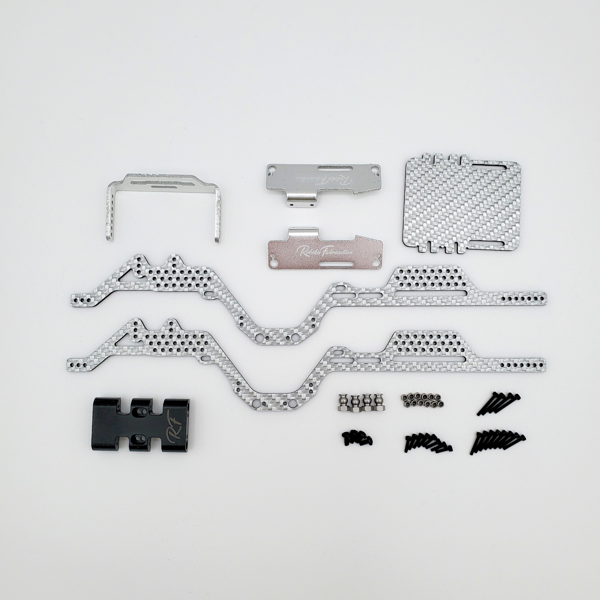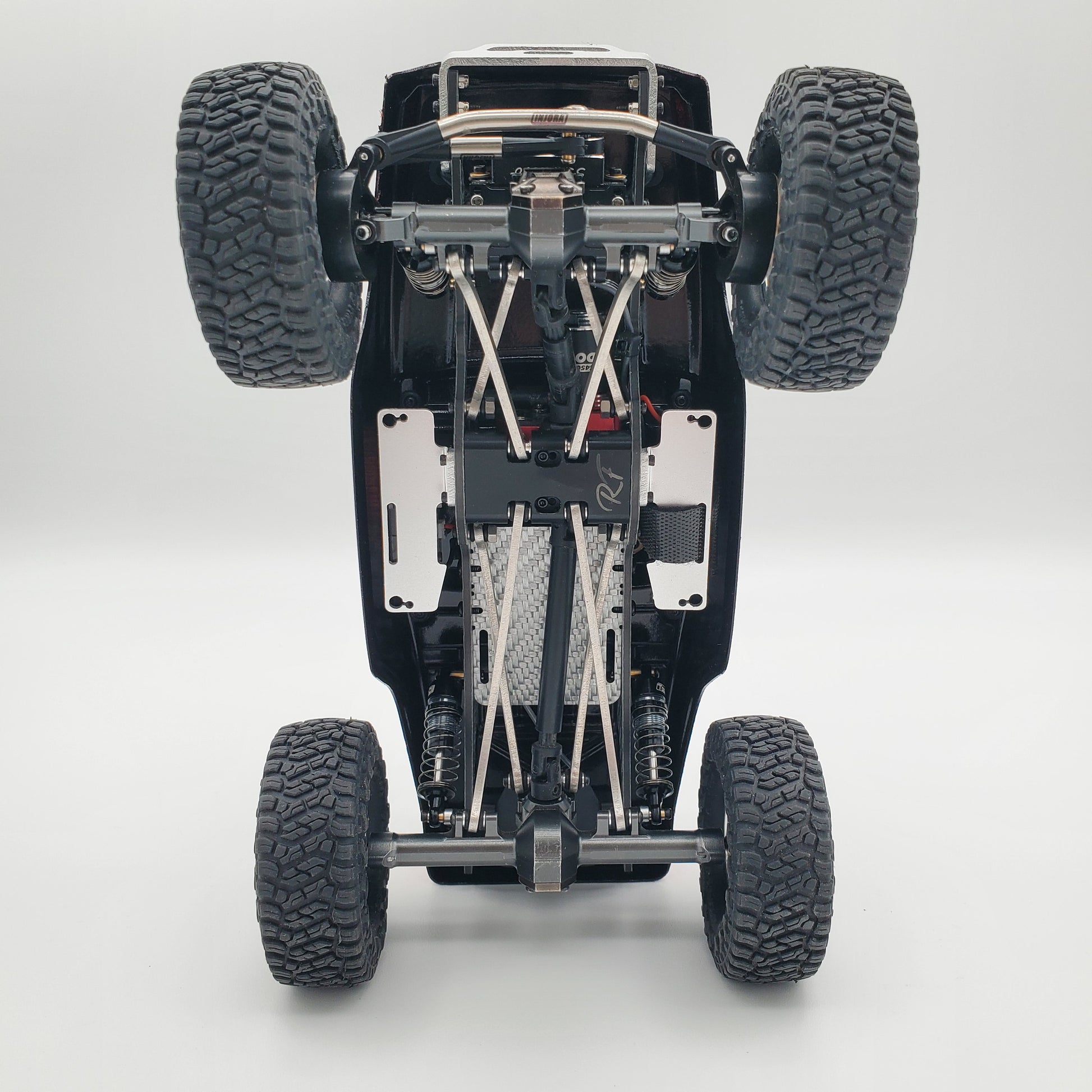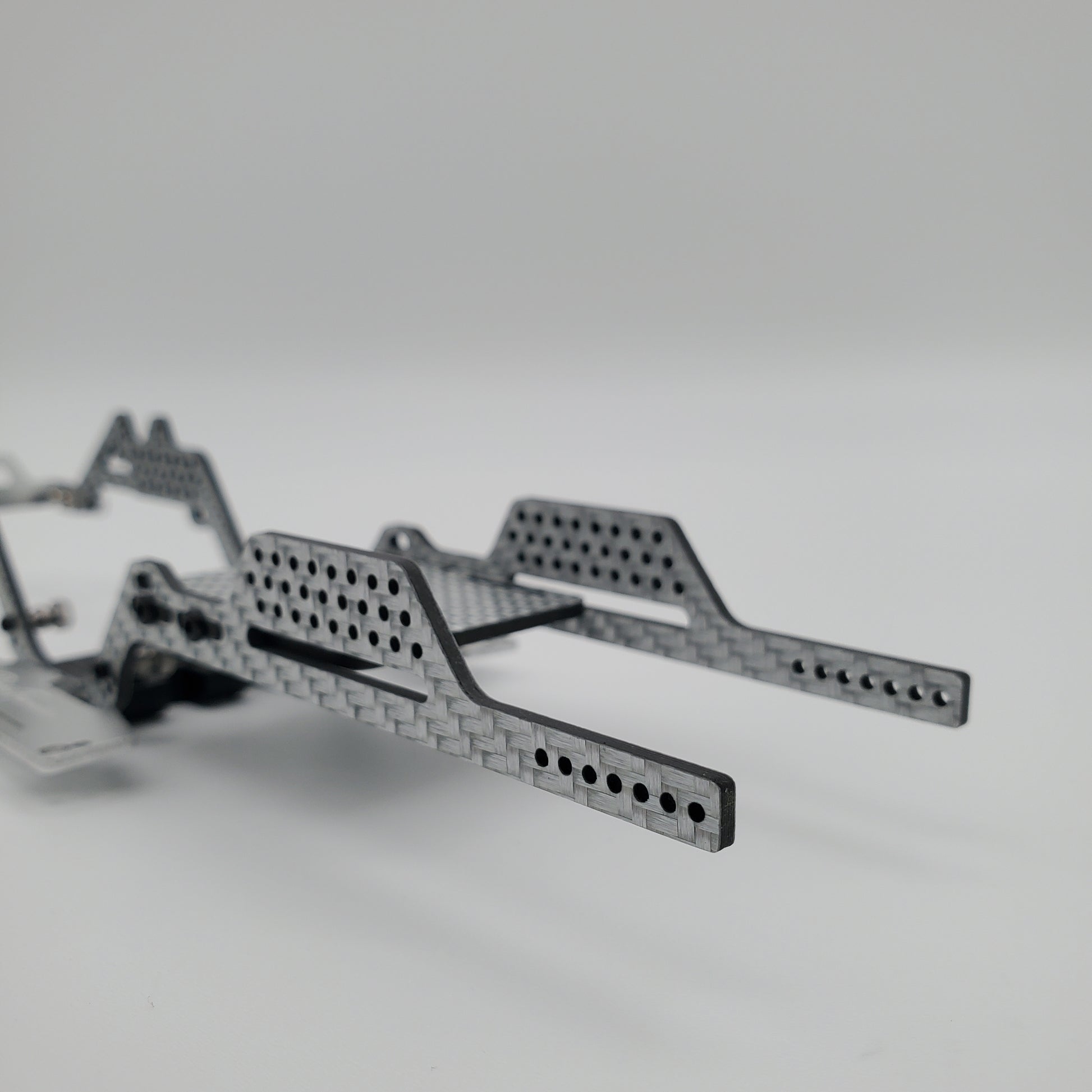 Factory mounting locations for OEM body mounts are built into the chassis, ensuring true plug-and-play installation without modification. The aluminum sliders feature integrated rock light mounting provisions and battery strap slots, adding durability in high-contact areas while maintaining a clean, functional profile. Designed around competitive geometry, the Carbon C1 includes a Delrin Reversible Comp Skid, allowing drivetrain positioning to be adjusted to suit different setups. A front bumper is included to complete the chassis and provide a clean, finished look right out of the box. Thoughtful hardware selection, including threaded pivots and locknuts, ensures a straightforward and durable assembly. With compatibility spanning wheelbases from 132–155mm, the Carbon C1 offers flexibility for a wide range of builds and configurations.